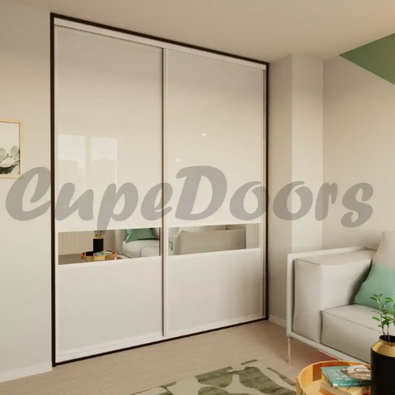 2. Корпус также изготовлен из материала белого цвета, а двери купе выполнены комбинированными с сочетанием зеркала и другого материала (ЛДСП/Стекло Lacobel) белого цвета.