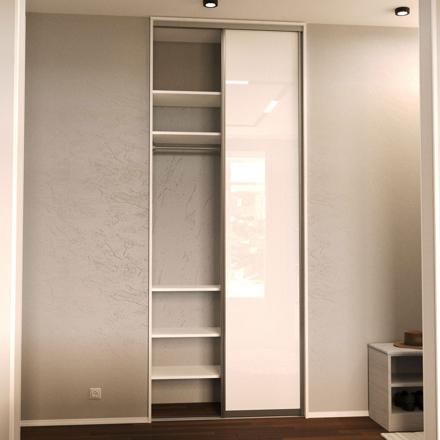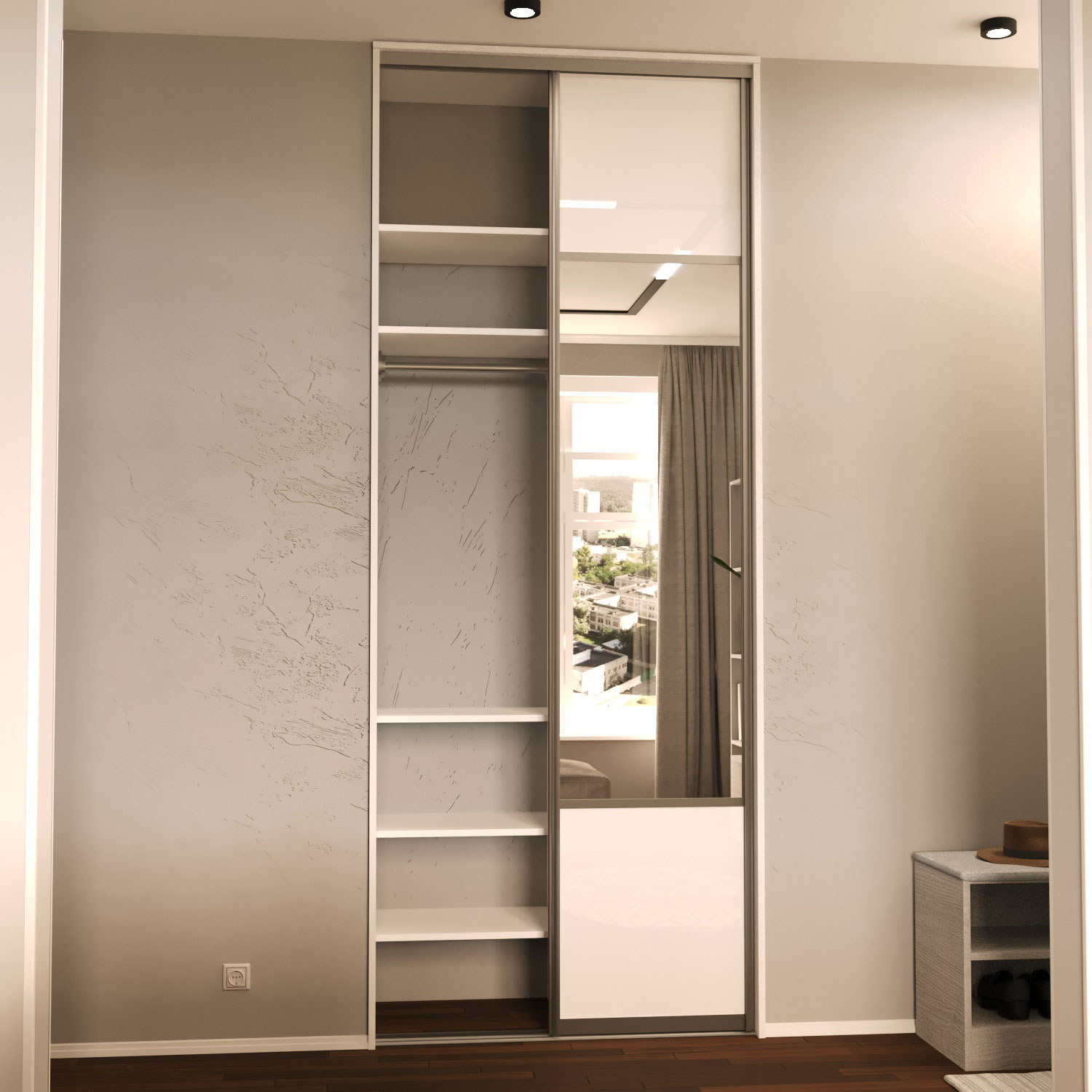 В этом случае двери купе устанавливаются отдельно от наполнения шкафа или гардеробной. Возможно изготовление вставки в двери купе единым полотном (без делительных профилей), т.к. размеры данных материалов это позволяют, к ним относятся: