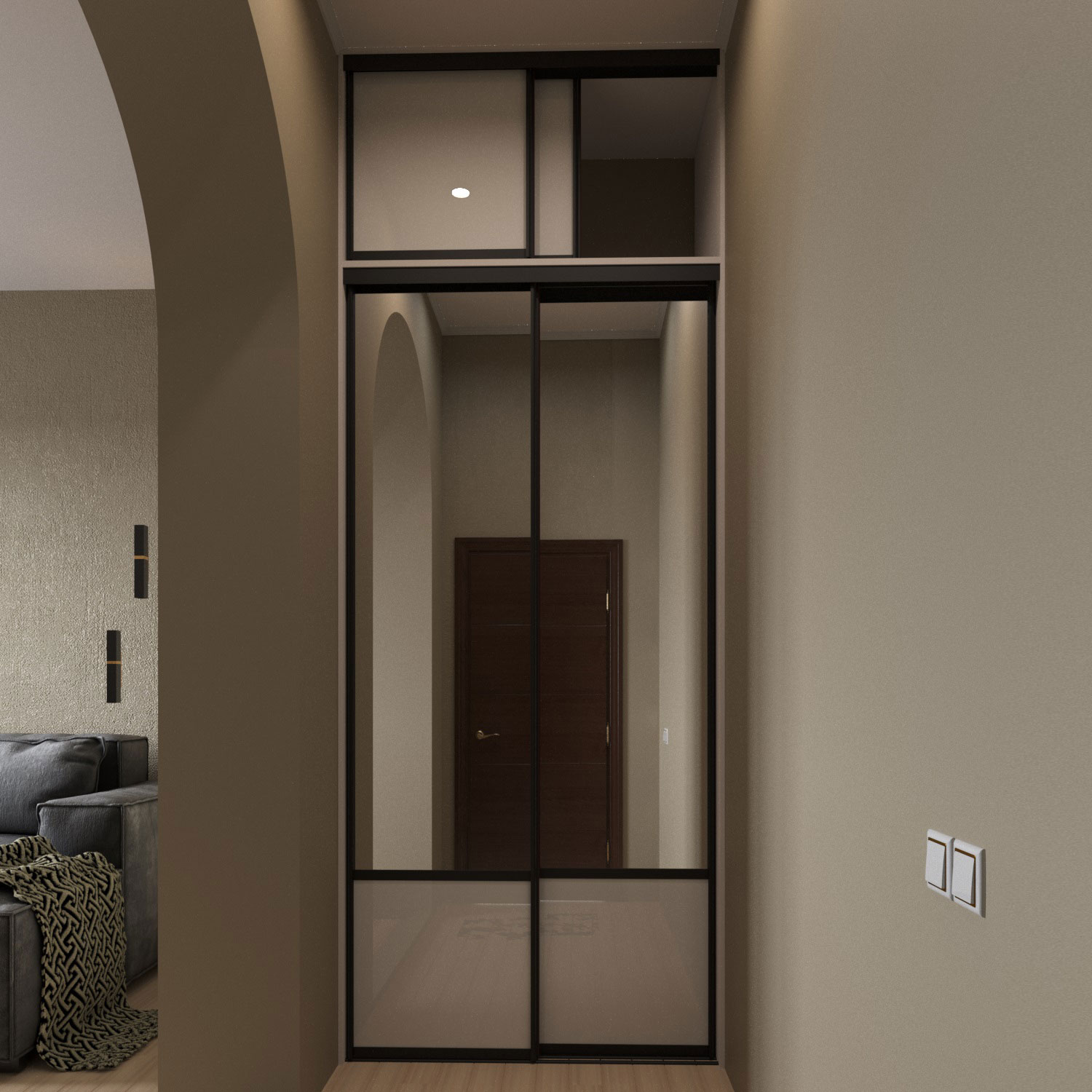 Поэтому самым предлагаемым вариантом является «двухэтажный» шкаф купе, в котором антресольная зона закрывается отдельными дверями купе, но видимая линия соединения корпусов (низ+антресоль) совпадает с линией установки антресольных дверей купе и таким образом менее «бросается в глаза», также большим плюсом будет являться тот факт, что такой шкаф будет удобнее: