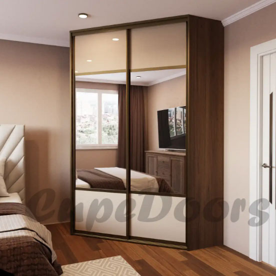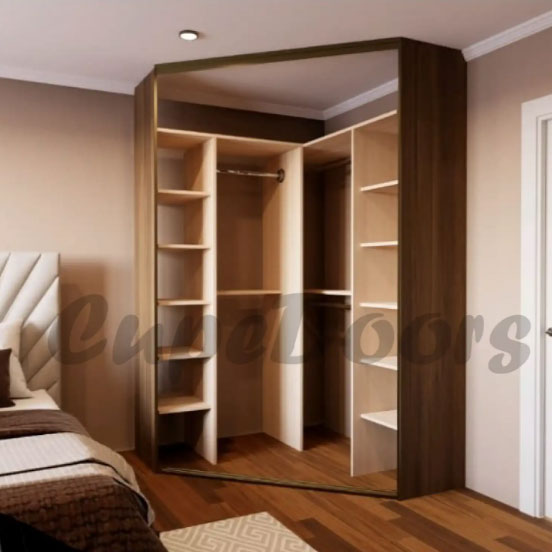 Если площадь комнаты позволяет, существует возможность установить трапециевидный шкаф купе, где двери купе устанавливаются по диагонали к боковым стенам, образуя мини гардеробную комнату, а установка внутреннего наполнения шкафа происходит по двум стенам.