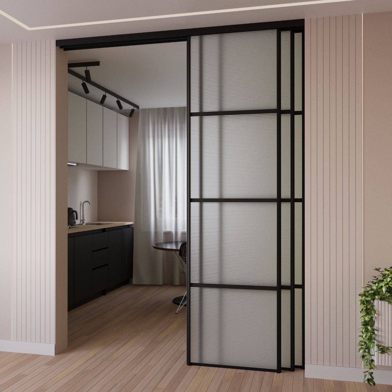 Подвесные двери без нижней направляющей сдвигаются в одну сторону, сохраняя максимум естественного освещения днем и обеспечивая широкий, комфортный проход. Тонированное стекло добавляет интерьеру глянцевую фактуру и поддерживает графичную черную линию профиля. Межкомнатные раздвижные перегородки обеспечивают хорошую звукоизоляцию, а двери бесшумно скользят и легко открываются, не требуя усилий.