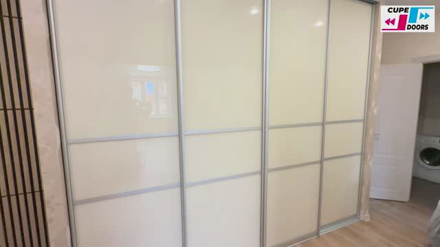 Наполнение (полки) изготовлены из ЛДСП Egger 3157 16 мм, 4 двери купе, вставка стекло Лакобель RAL 1013 (светлый бежевый глянец), с горизонтальным делением на 3 части, система нижнего качения Аристо Стандарт, профиль С «хром матовый».