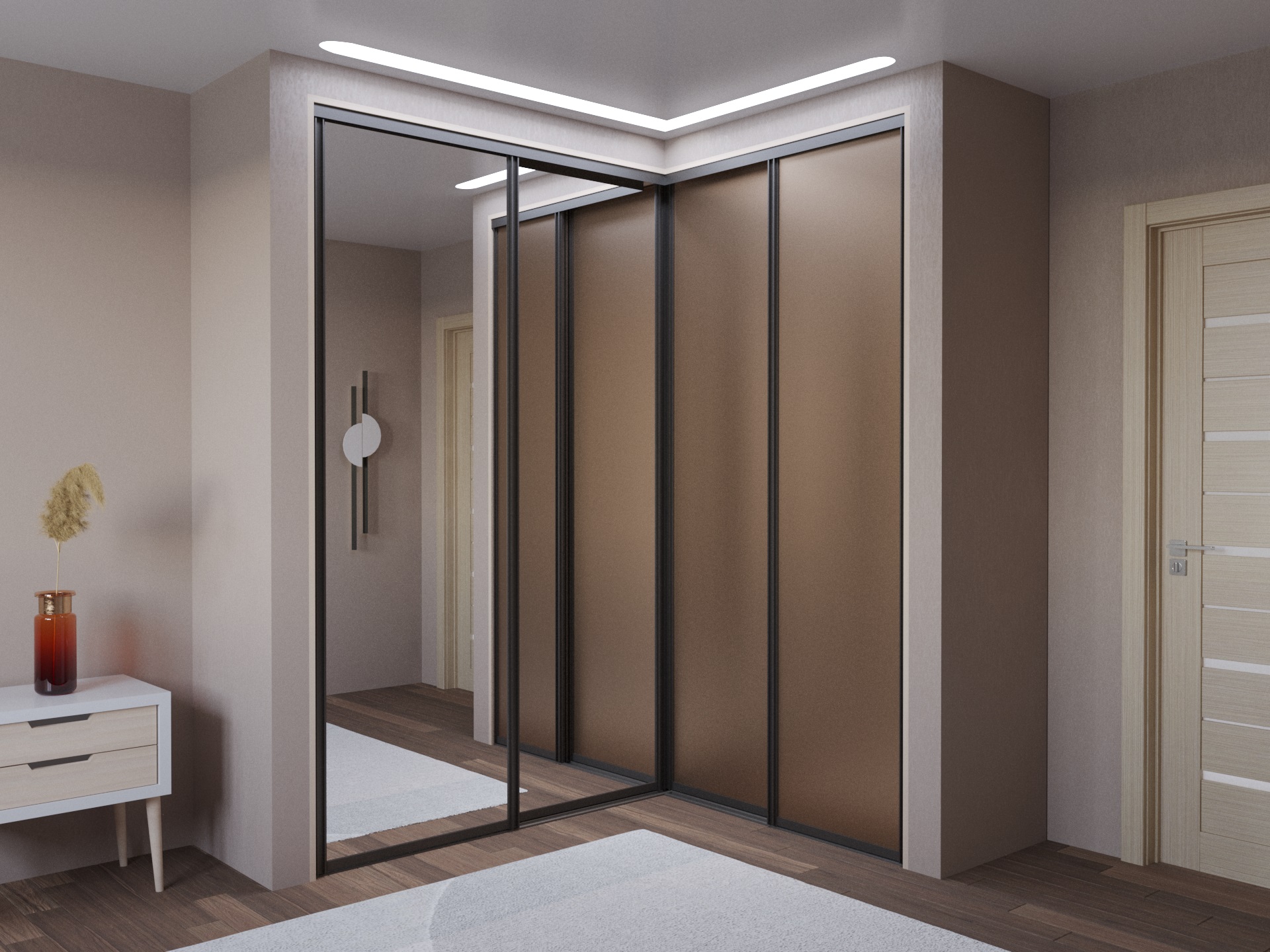 - внешний угол (двери‑купе на расстоянии от стен, создаётся мини‑гардеробная);