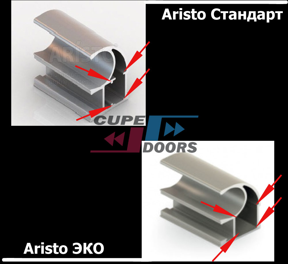 В профиле Aristo ЭКО нет внутренних рёбер (см. рисунок ниже), которые играют роль усилителя. Они делают конструкцию профиля жёстче.