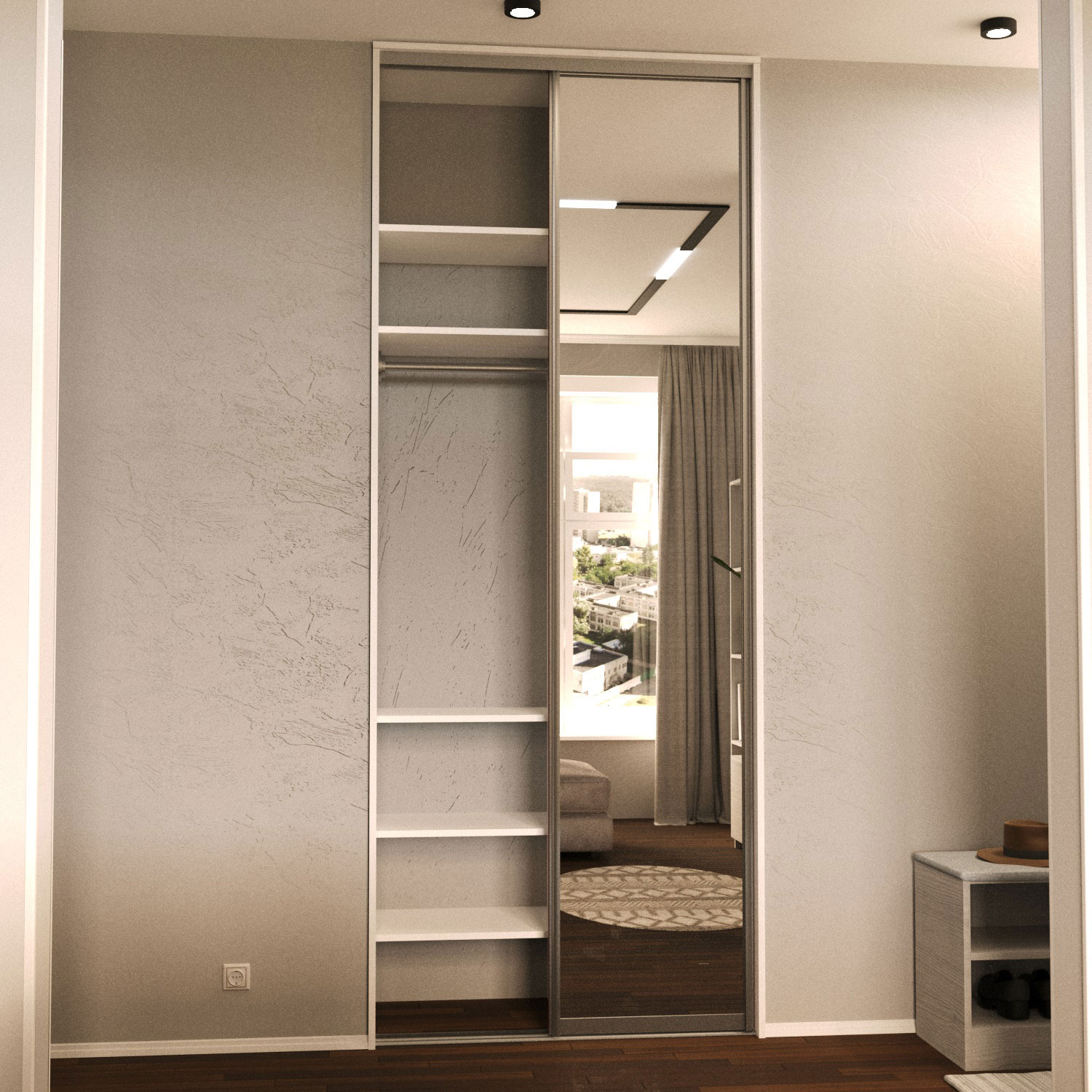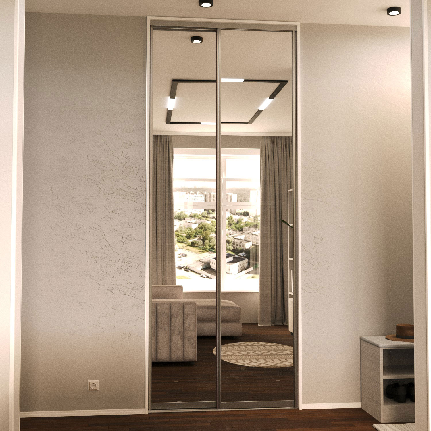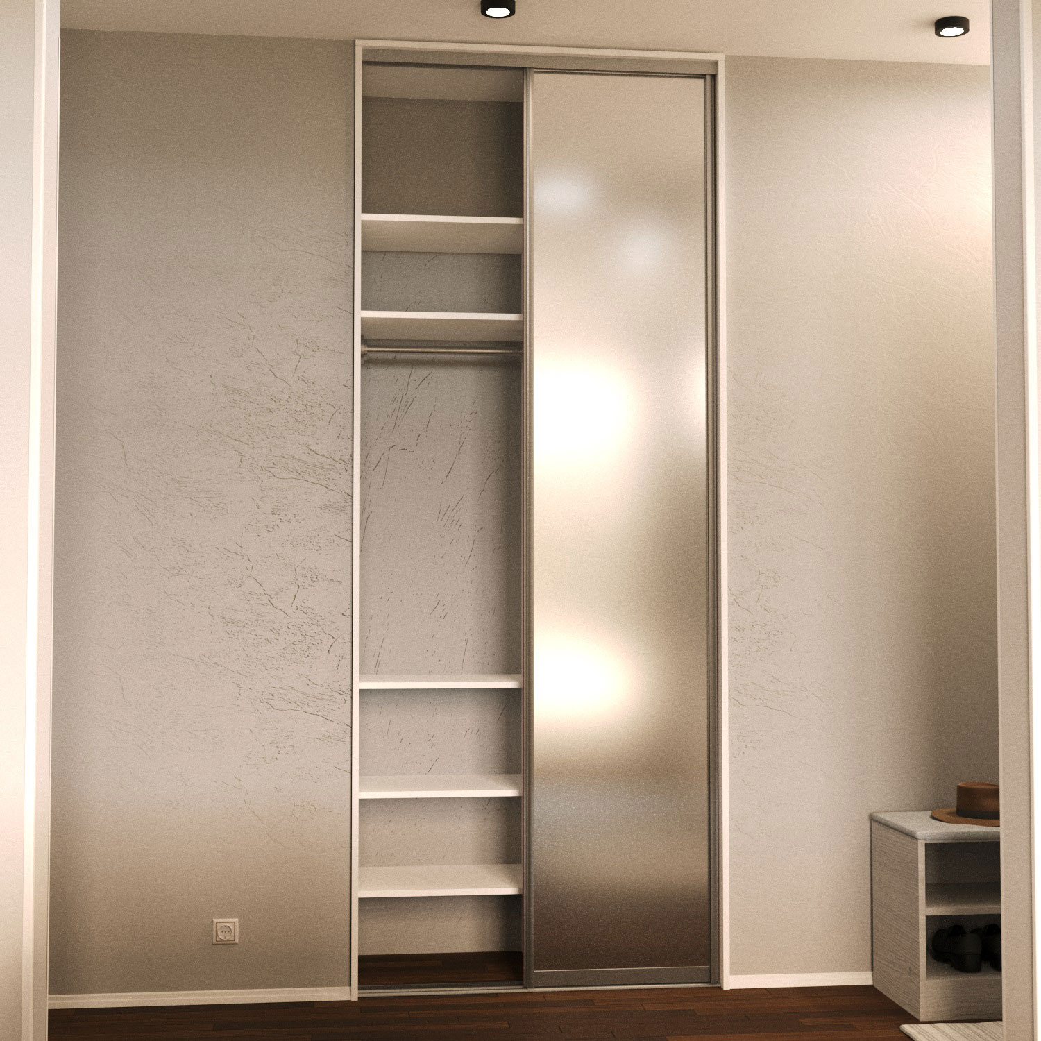 В этом случае двери купе устанавливаются отдельно от наполнения шкафа или гардеробной. Возможно изготовление вставки в двери купе единым полотном (без делительных профилей), т.к. размеры данных материалов это позволяют, к ним относятся: