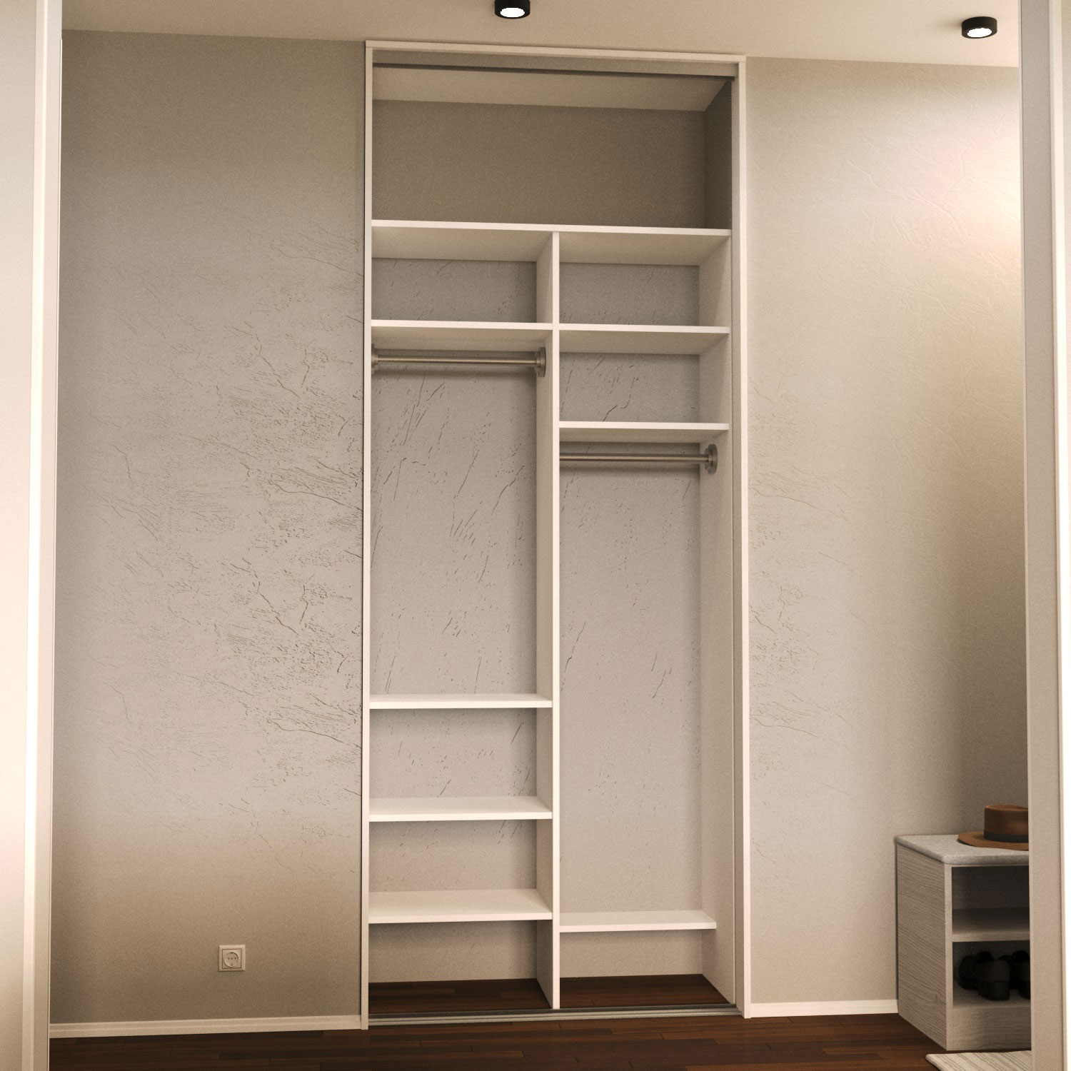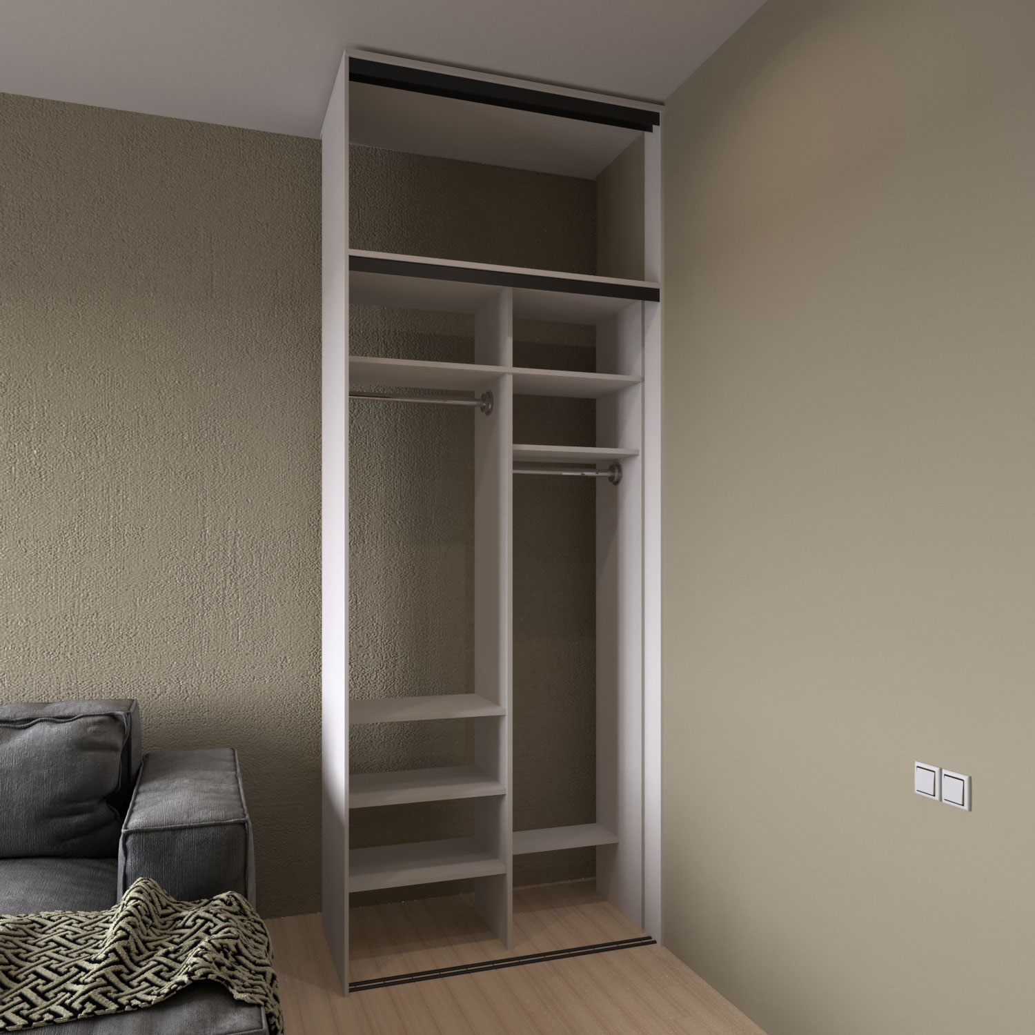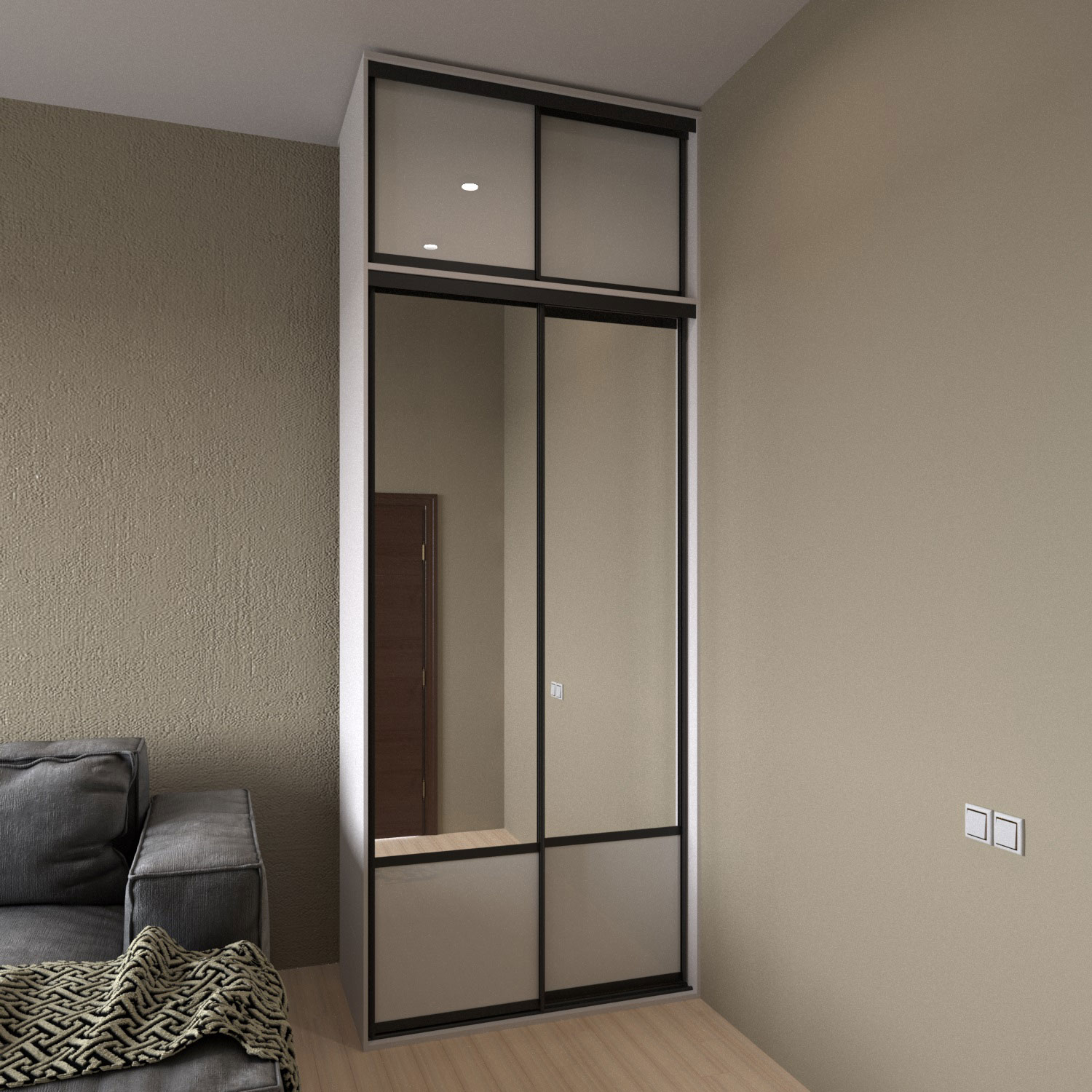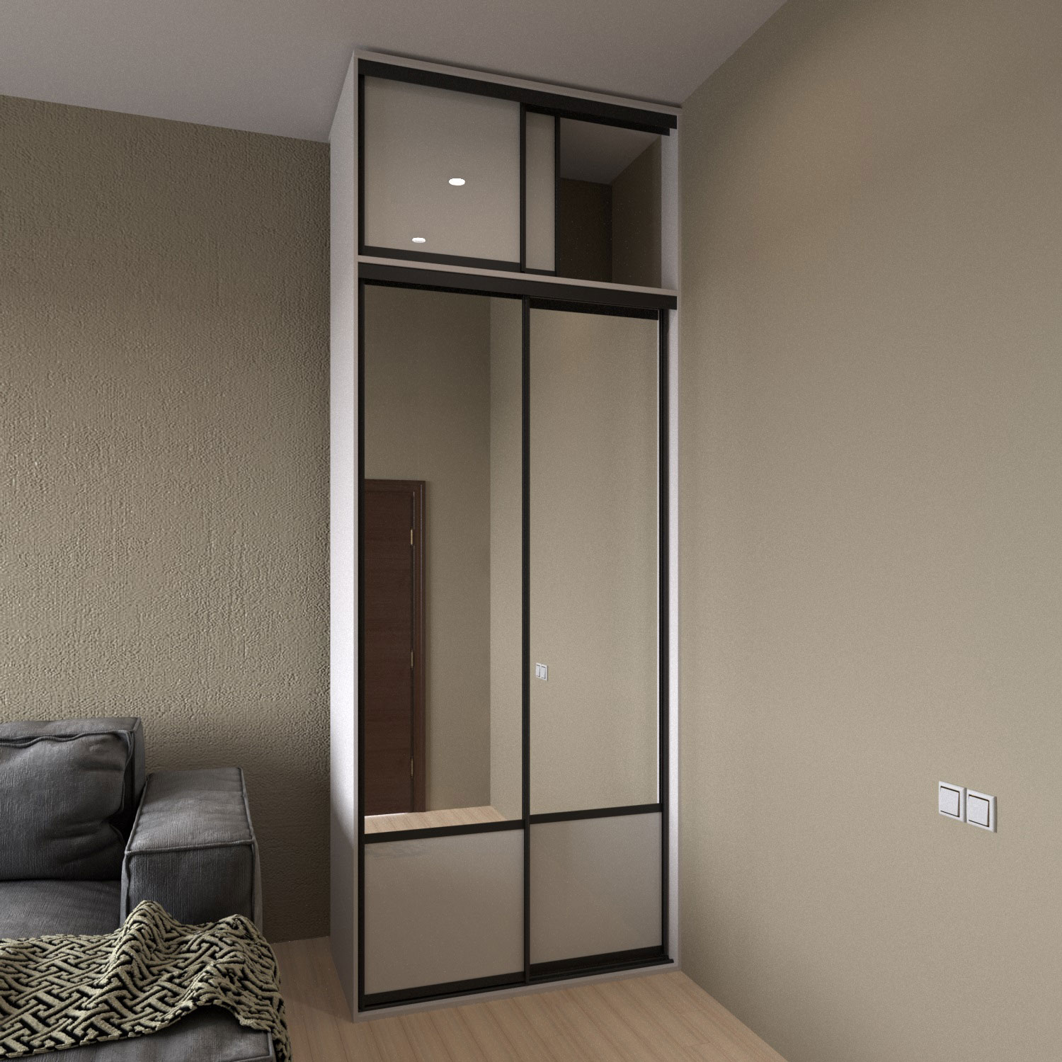 Поэтому самым предлагаемым вариантом является «двухэтажный» шкаф купе, в котором антресольная зона закрывается отдельными дверями купе, но видимая линия соединения корпусов (низ+антресоль) совпадает с линией установки антресольных дверей купе и таким образом менее «бросается в глаза», также большим плюсом будет являться тот факт, что такой шкаф будет удобнее: