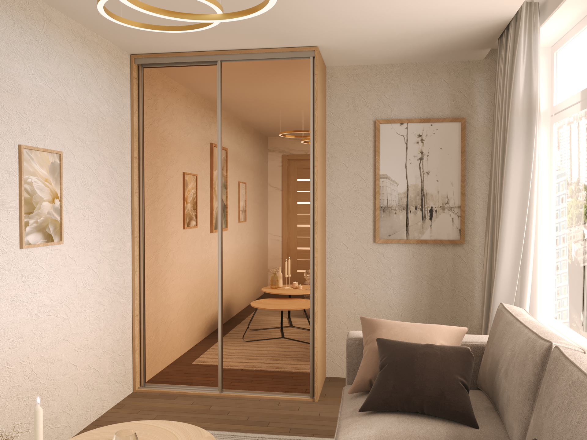 Зеркальный шкаф купе идеально подойдет для узких и небольших помещений, где хотелось бы визуально расширить пространство. Зеркала увеличивают пространство на 30–40%