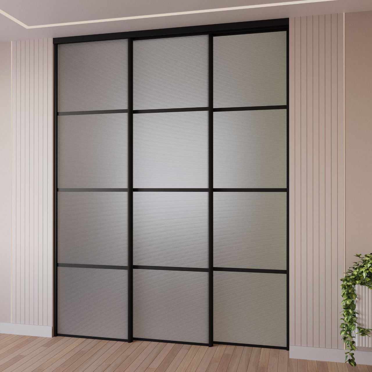 Подвесные двери без нижней направляющей сдвигаются в одну сторону, сохраняя максимум естественного освещения днем и обеспечивая широкий, комфортный проход. Тонированное стекло добавляет интерьеру глянцевую фактуру и поддерживает графичную черную линию профиля. Межкомнатные раздвижные перегородки обеспечивают хорошую звукоизоляцию, а двери бесшумно скользят и легко открываются, не требуя усилий.
