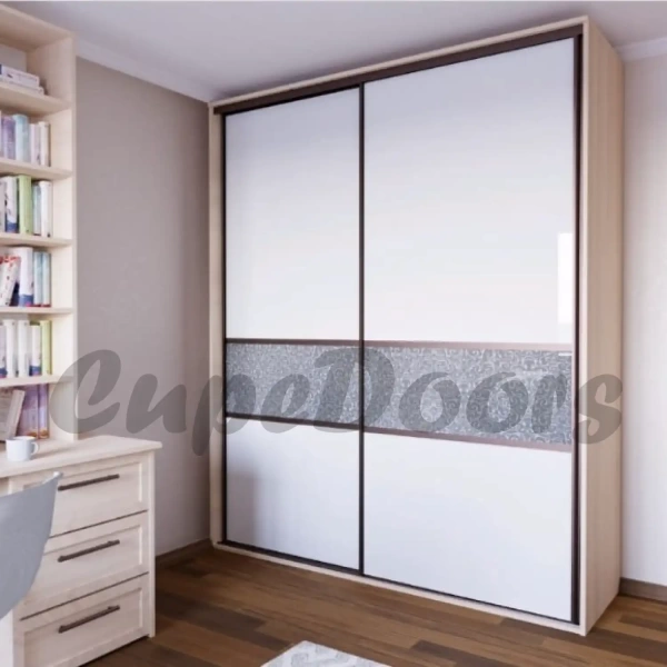 Раздвижная система Аристо Стандарт, профиль «С» (шампань матовая), двери купе комбинированные: крашенное стекло Lacobel RAL 9003 (белый глянец) и вставка из декоративного стекла SMC-ODG-038 «серебро».