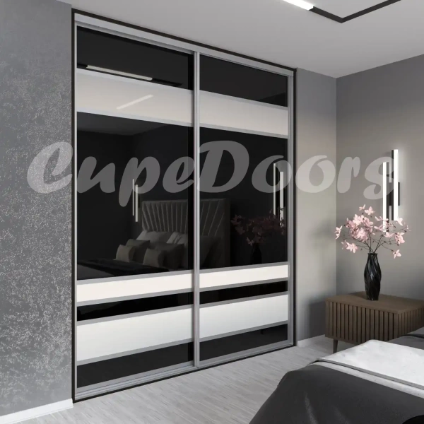 В наполнении дверей использовались вставки из стекла Лакобель, основной цвет RAL 9005 (черный) с добавлением узких полос RAL 9003 (белый).