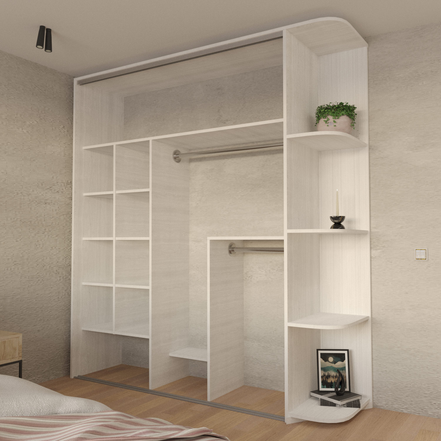 Отдельностоящий 2-дверный шкаф купе с закругленными открытыми полками (В × Г × Ш): 2600 × 600 × 2100 мм (основной шкаф 1800 + декоративные полки 300) мм.