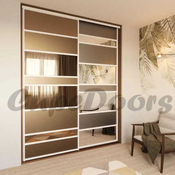 Раздвижная система: Аристо Стандарт, профиль /С/ (хром матовый), двери купе комбинированные: ассиметричное горизонтальное деление материалов: зеркала «серебро» / «бронза» /сатинированные (матовые) зеркала «серебро» и «бронза».
