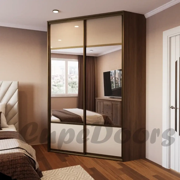 Раздвижная система Аристо Стандарт, профиль /С, (шампань матовая), двери купе комбинированные, вставка зеркало «серебро», сверху и снизу вставки из стекла крашенного Lacobel RAL 1013 (светлый беж глянец).